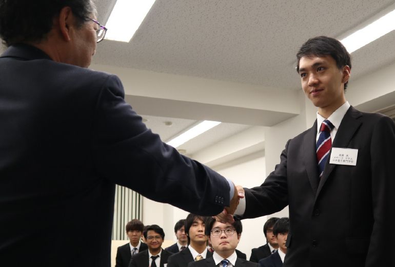 社長から内定証書の授与式。1人ずつ握手も交えながら、今後の成長への期待を伝えています。