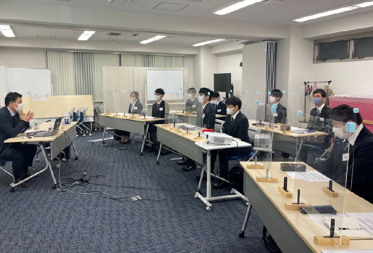 コロナ禍での入社式では、パーテーションをDIYで自社作成しました。
