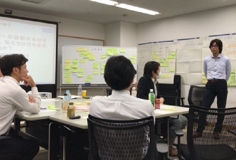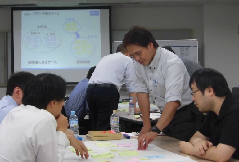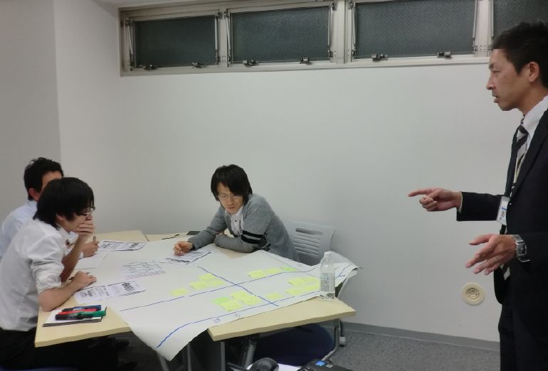 こちらも役職者の研修。模造紙に書くことで、全体の見える化を行いながら、課題の共有などを行います。