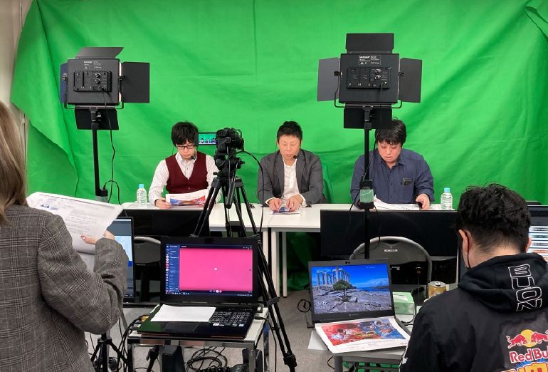 E-sport部の初回はゲーム実況のプロの方もお呼びし、配信を行いました。セットやカメラも本格仕様!