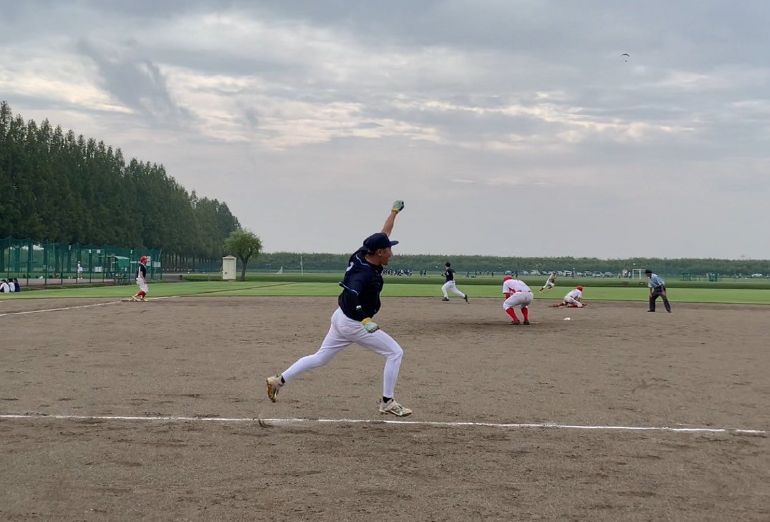 他企業様との野球の試合。ガッツポーズですが、果たして試合結果はいかに!?